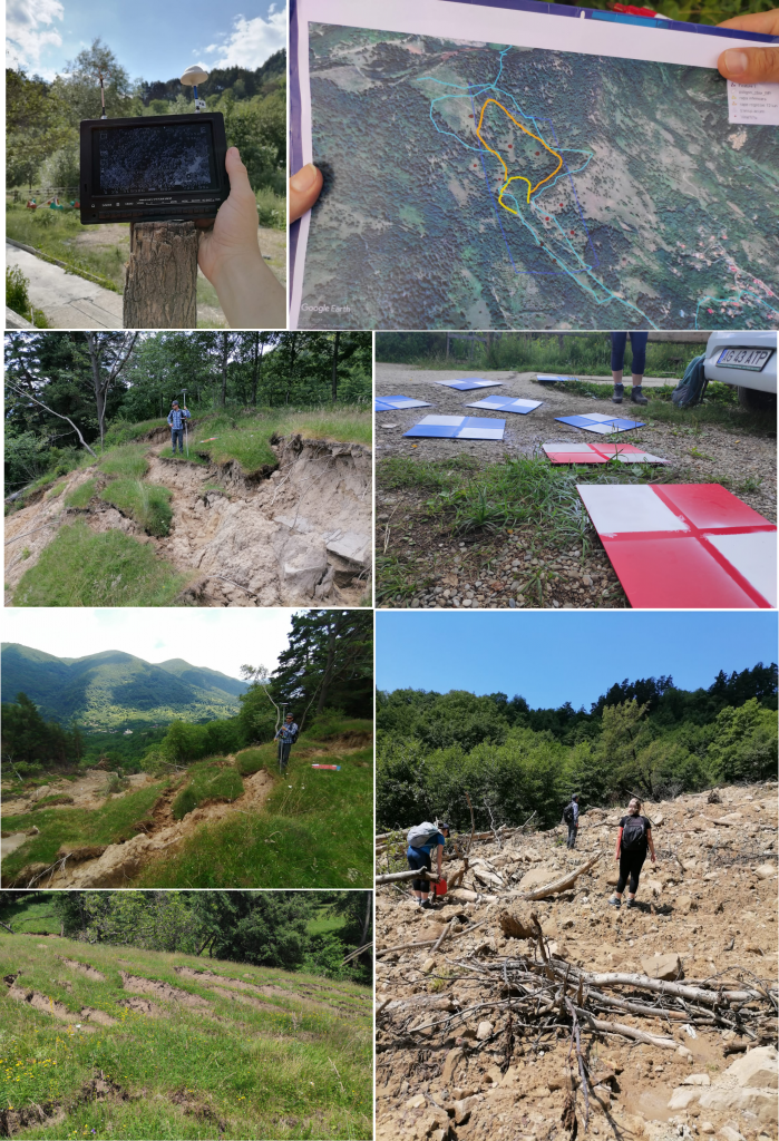 In 9 and 10 July, part of the UB team went to the recently-produced landslide in Bâsca Rozilei village, Buzău county, for supplementary observation and a UAV survey of the site. The resulting aerial photographs cover 0,98 square km, enclosing the body of the landslide, an intermediate collapsed sector and a secondary upper-hill scarp. The resulting orthophotoplan shows the ground morphological particularities that resulted from the movement. This enables mapping the specific sectors and better estimate the volume of the landslide and also contributes to the analysis of ancient landslides morphology in the area. UAV surveys in this study site are part of WP2, Task 2.1 Remote sensing and in-situ topography. Many thanks to our volunteer students Sabina Calisevici and George Boeriu, who were more than supportive!